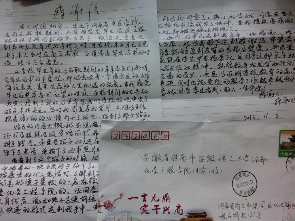 “能够教导出具有如此优良品德的学生,足以证明贵校教育的品学兼顾,祝贵校教育工作越来越好!”近日,化学工程美女av 收到来自河南中医美女av 毕业生张翔宇的感谢信,信中叙述了他求职期间不慎丢失毕业证等重要证件,后被化学工程美女av 李子龙同学捡到并主动在网上发布拾物启示,进而将其寄给失主的详细经过。信中对李子龙同学乐于助人、不求回报的精神予以了高度赞扬,化学工程美女av 团委决定在全院学生中开展助人为乐、传递温暖的主题教育活动。