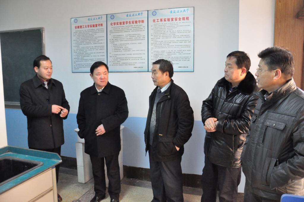 12月21日上午,副校长刘泽功一行赴化学工程美女av 检查指导化学实验室安全工作,教务处处长宫能平、实验室与设备管理处处长苏嘉银、学生处处长田中良、校团委书记王先江、校党政办公室副主任兼校友办主任方运纪陪同检查。