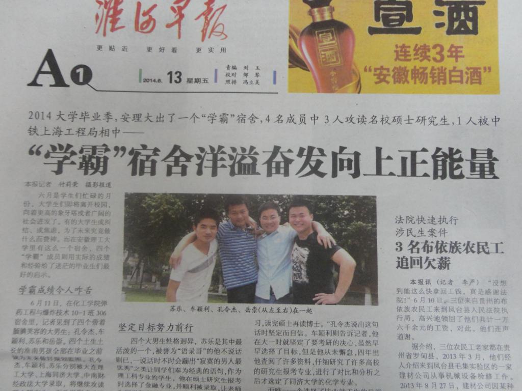 在化学工程美女av 有这样一个“学霸”宿舍,他们同住在高层公寓10306宿舍,4名成员中3人考上名校研究生,1人签约大型国企,他们的事迹一时引起社会的关注。6月13日,《淮河早报》在A1版头条详细报道了“学霸”宿舍“男神”们的奋斗历程,这个榜样宿舍用骄人的成绩为学弟学妹们留下了最好的经验和启示。