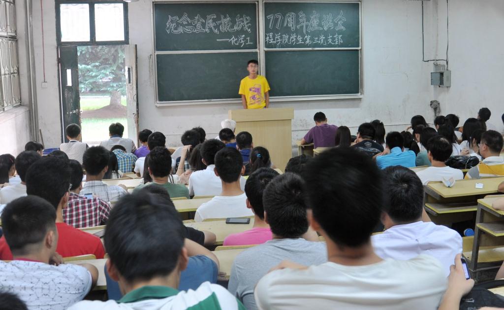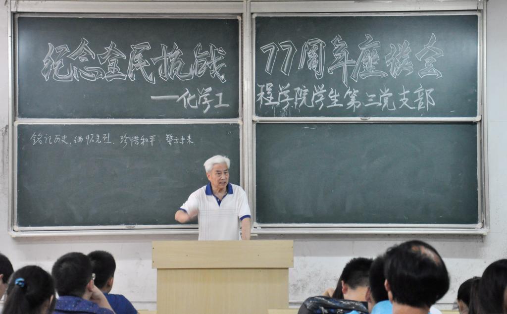 在全民族抗战爆发七十七周年之际,7月7日晚,化学工程美女av 党委学生第三党支部召开党员大会,师生党员在美女av 关工委副主任、老党员汪大立的带领下回忆抗战历史、缅怀革命先烈、反思历史教训、积聚奋斗力量。
