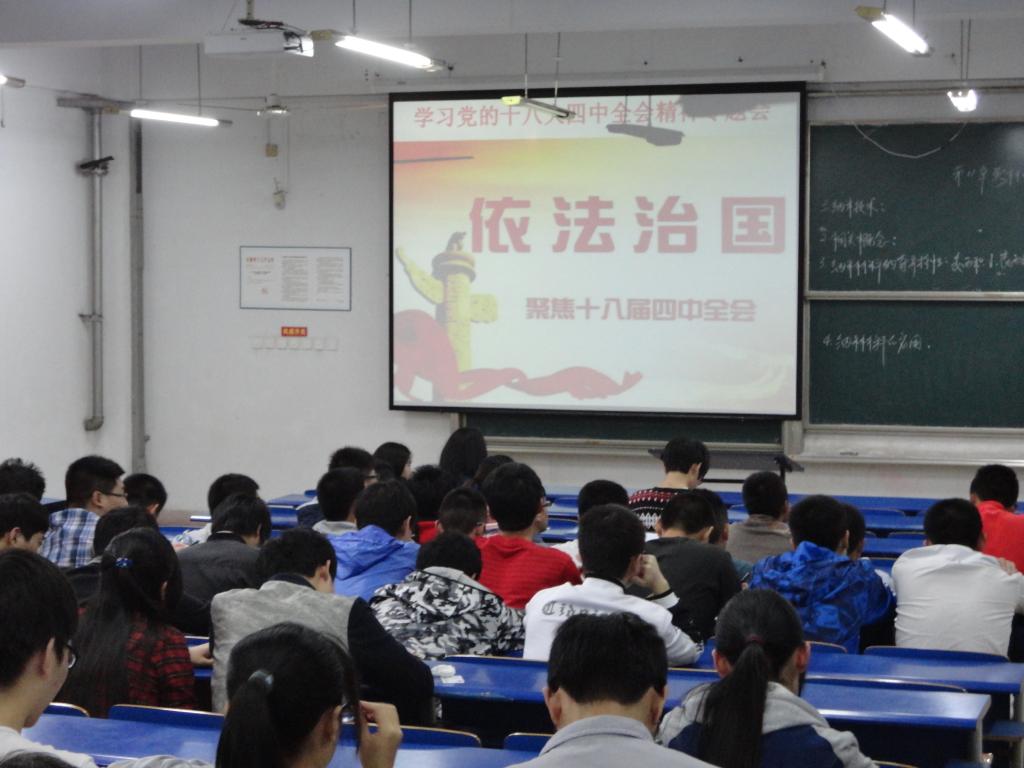 会上,围绕中央四中全会召开的背景、历届四中全会主题、十八届四中全会全文公告、四中全会焦点事件、国家改革开放以来依法治国的路线图、大学生如何贯彻宣传全会精神等问题进行热烈讨论。