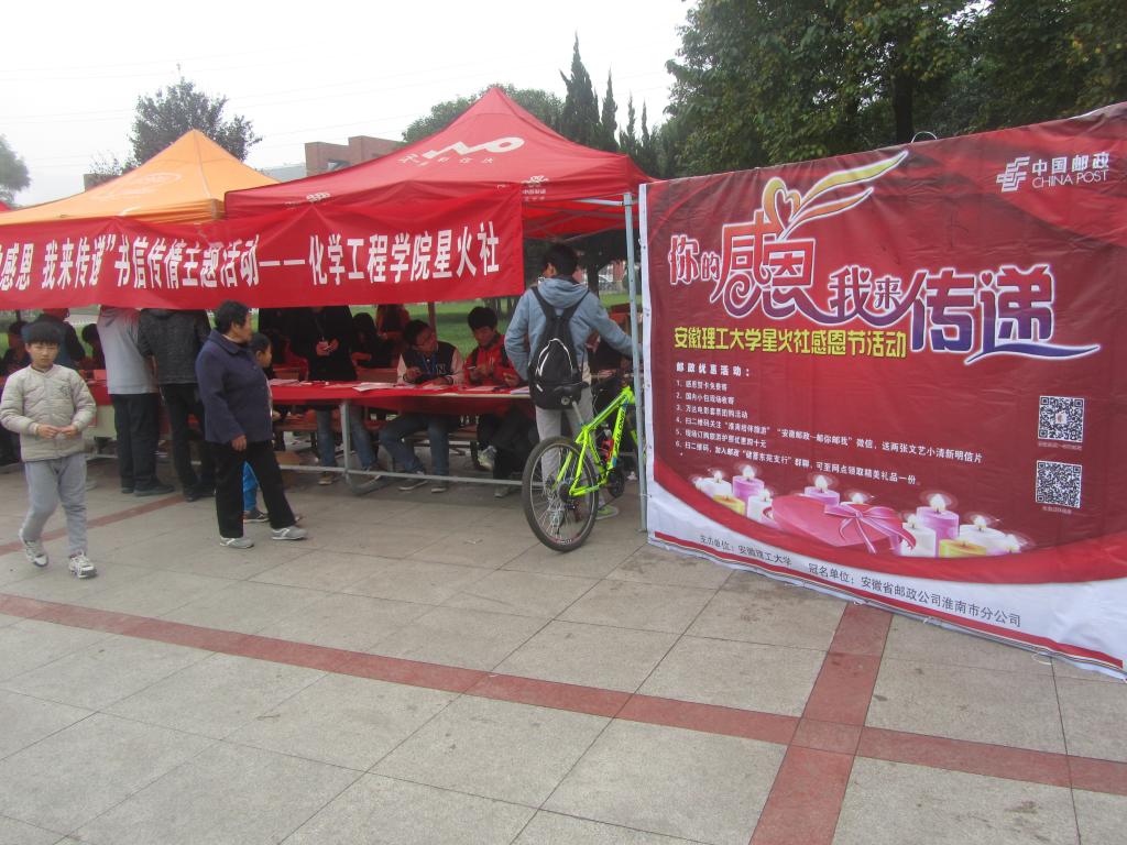 11月23日,值感恩节来临之际,化学工程美女av 联合安徽淮南邮政淮南分公司在北区喷泉广场举办了以“你的感恩,我来传递”为主题的免费邮寄书信活动。