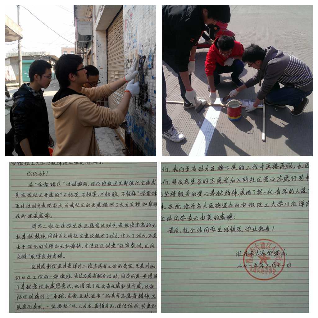 对于同学们的行动,大通区大通街道办事处的领导给予高度评价,并亲笔写了感谢信。弹药13-2班团支书胡晓说:“也许小广告还会再次出现,也许道路上的交通标志还会变得模糊,也许几个人的血液不够救活很多生命。但是我相信,每个参加了活动的同学都明白了一个道理:奉献比索取有意义的多。雷锋精神不应该响亮是口号,而应该是实际行动。”