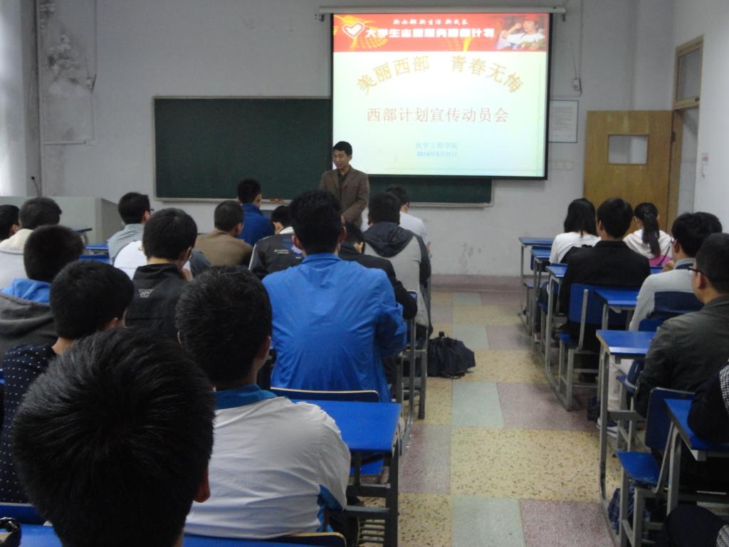 5月11日上午,化学工程美女av 在新教1102教室组织召开2015年大学生志愿服务西部计划动员宣讲会,宣传“西部计划”相关内容,鼓励毕业班学生积极报名、到广阔基层建功立业。美女av 党委副书记徐泽绵、团委副书记杨志华及40余名同学参加了会议。
