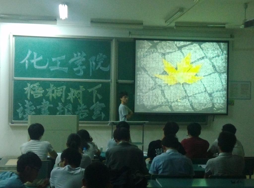5月16日晚,读书报告会在北实204教室举行。各参赛选手采用ppt展示和现场讲解相结合的方式,用简洁、生动的语言介绍了各自所读作品并畅谈了自己的心得体会。特能14-1班的孙晓勇同学凭借其对《曾国藩》一书的翔实剖析和深刻感悟摘得桂冠;市场营销14-1班梁丹莉和化工14-4班吴祥获二等奖;应化14-1班王诗涵、化工14-1班陈莹莹、应化14-2班吕开红同学等获三等奖。