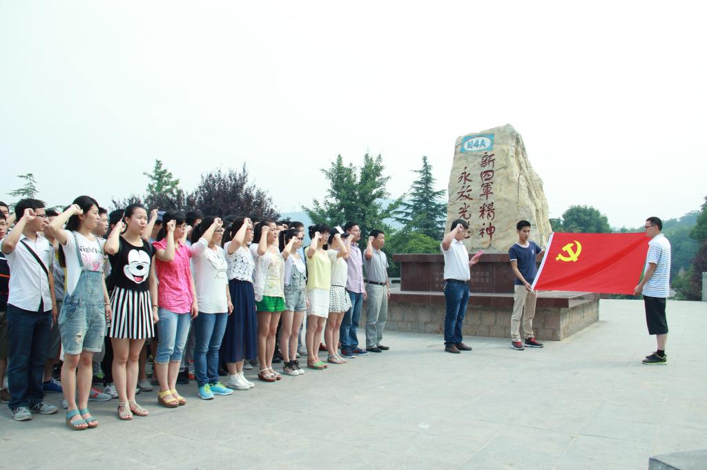 “我志愿加入中国共产党,拥护党的纲领,遵守党的章程,履行党员义务,执行党的决定,严守党的纪律,保守党的秘密,对党忠诚,积极工作,为共产主义奋斗终身,随时准备为党和人民牺牲一切,永不叛党。”在“新四军精神永放光芒”纪念碑前,全体党员在学生党员代表邵珂带领下,面向党旗再次庄重宣誓,承诺在今后的学习和工作中继承铁军精神,锤炼作风,践行社会主义核心价值观,正确行使党员权利,切实履行党员义务。