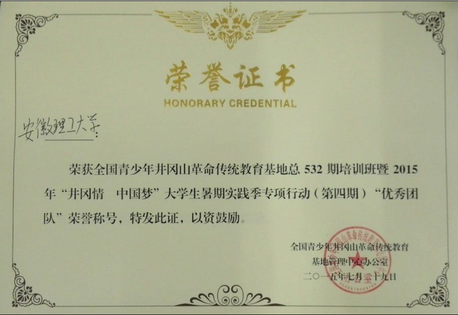7月30日,由团中央学校部、全国青少年井冈山革命传统教育基地管理中心联合主办的2015年“井冈情•中国梦”全国大学生暑期实践季专项行动(第四期上)顺利结束了为期9天的活动,我院杨志华、钱元两位老师带领20名学生组成的国家级实践团队——“井冈山群众路线新故事寻访团”团结协作、勇于争先,圆满完成各项实践任务,以综合评分第一名的成绩荣获优秀实践团队荣誉称号,充分展示了我校师生的良好风采。