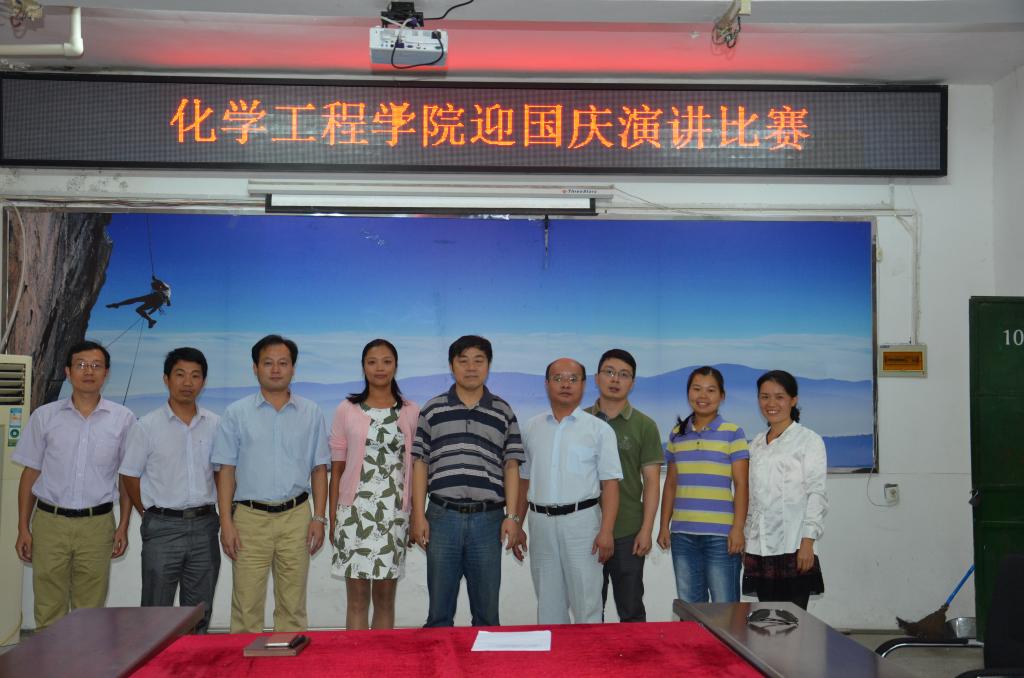 为庆祝祖国六十六华诞,9月29日下午,化学工程美女av 工会在院会议室举行“喜迎国庆·爱岗敬业”教职工演讲比赛。美女av 院长何杰,副院长、院工会主席邢宏龙,院党委副书记徐泽绵,制药系主任李忠担任评委。