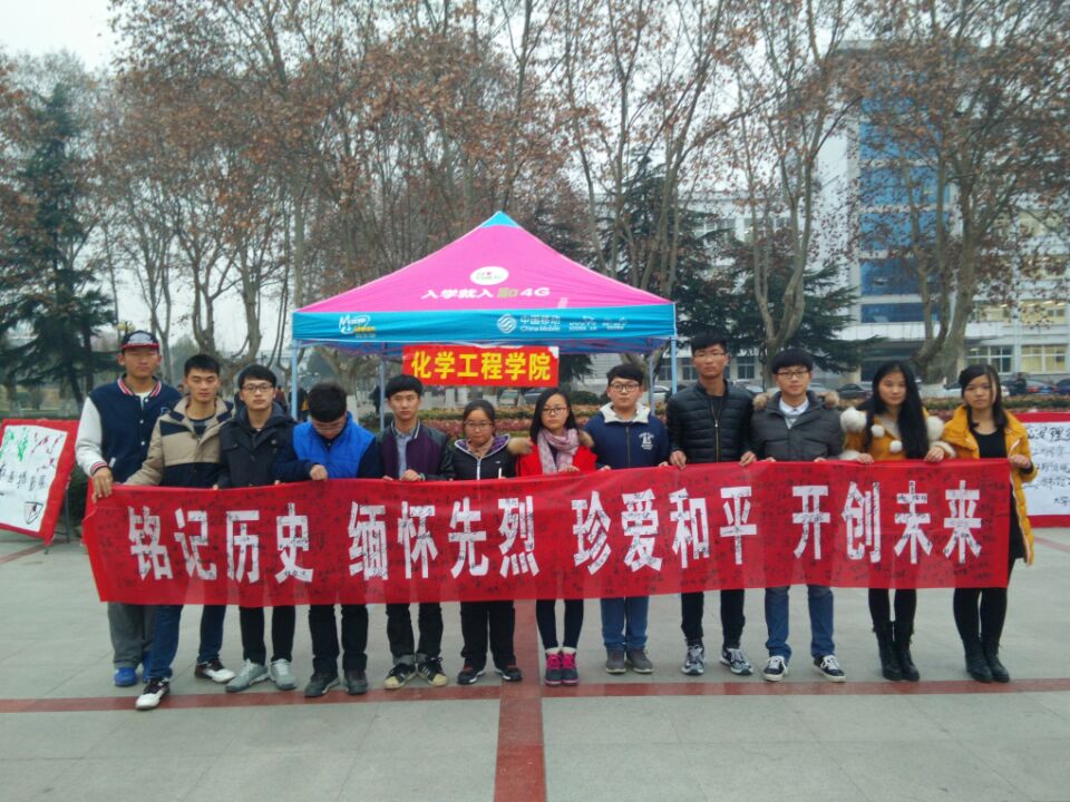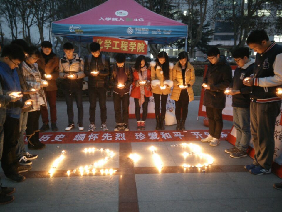 12月13日是国家立法设立的南京大屠杀死难者国家公祭日,今年又逢纪念抗战胜利70周年的特殊时刻,化学工程美女av 团委组织学生团支部书记与网络文明传播志愿者们携“铭记历史•缅怀先烈•珍爱和平•开创未来”主题横幅在北区喷泉广场进行国家公祭日纪念活动,以特别的形式祭奠78年前惨死在日本侵略者屠刀之下的30万无辜同胞。