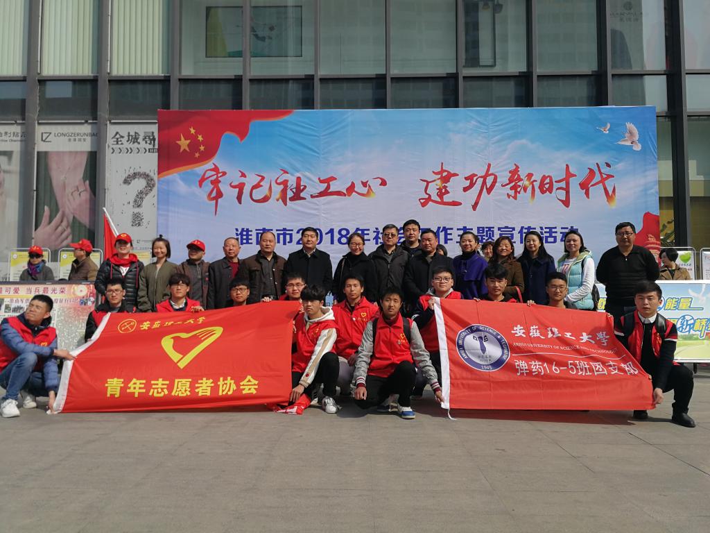 牢记社工心建功新时代。3月22日,弹药16-5班团支部联合淮南市民政局开展了淮南市2018社会工作主题宣传活动,活动在市区新世界广场成功举办。活动现场上,志愿者们用讲解和发放传单的形式向广大市民介绍、宣传社会工作政策法规、理念知识、服务项目等,并呼吁大家关注和参与社会工作。同时志愿者们还深入社区向工作人员和居民介绍了社工具体能做些什么、我市社会工作发展现状和项目进展等情况,使社区居民对社会工作有了进一步认识,提高了公众对社会工作的认知度与参与度。