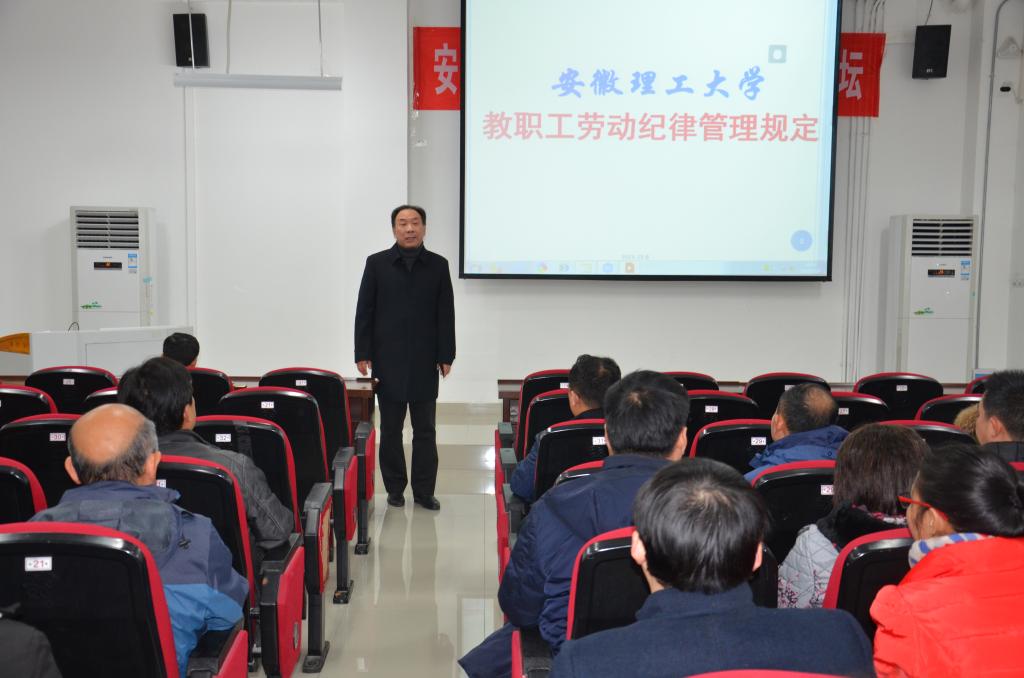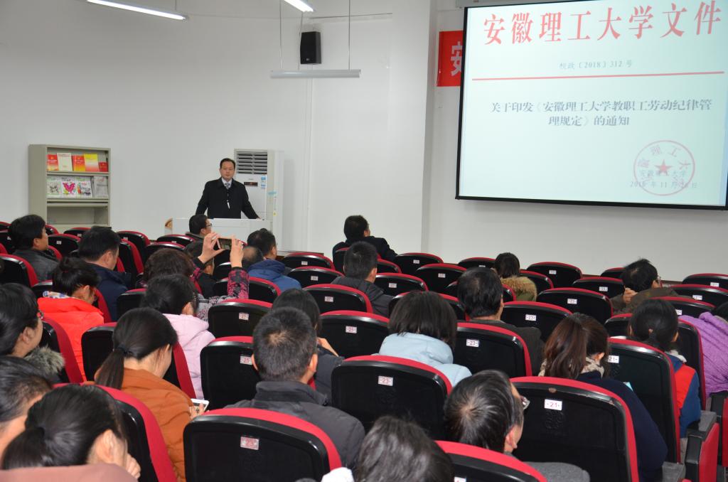 为推动美女av 教职工全员遵守《美女av 教职工劳动纪律管理规定》,12月6日下午,化学工程美女av 召开全体教职工大会,细化说明文件要求,并结合美女av 实际推行美女av 教职工请假规定,进一步强化劳动纪律的落到实处。会议由美女av 党委书记王大贤主持,副院长邢宏龙(主持工作)就劳动纪律和请假要求作说明。