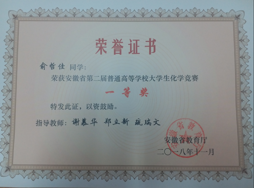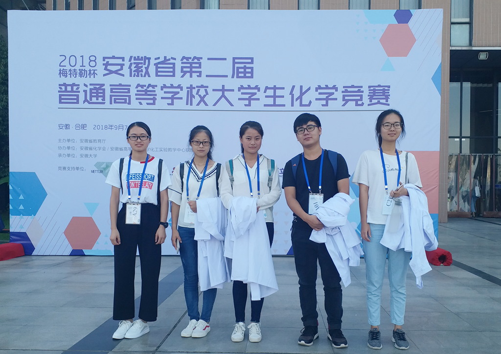 由安徽省教育厅主办,安徽大学承办,安徽省化学会和安徽省高等学校化学化工实验教学中心联席会协办的2018“梅特勒杯”安徽省第二届普通高等学校大学生化学竞赛决赛在安徽大学磬园校区举行。共有来自中国科学技术大学、合肥工业大学、安徽大学、安徽师范大学等高校组成的31支队伍共153名同学参加本次比赛。我校通过预赛选拔和暑期训练,由5名同学组成的美女av 代表队参加了决赛。经过努力拼搏,我校学子取得优异成绩。来自化学与工程美女av 的俞哲佳同学荣获一等奖、张庆洋、蔡乐乐、刘娜同学荣获二等奖。在安徽省化学会年会上举行了化学竞赛的颁奖仪式。