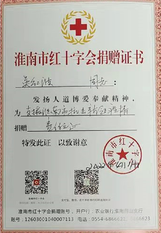 近日,淮南疫情防控形势较为严峻,田家庵区政协委员、我校化工美女av 爆炸科学与工程系教师吴红波副教授主动联系淮南市红十字会,捐款1000元助力淮南疫情防控工作。市红十字会收到捐赠后向吴红波颁发了荣誉证书。