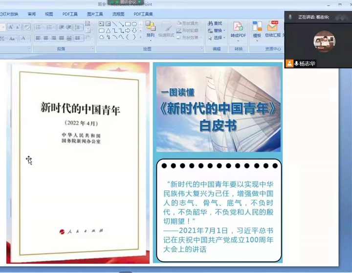 5月4日下午,化工美女av 团委老师杨志华老师通过腾讯会议带领美女av 团员青年认真学习《新时代的中国青年》白皮书。他介绍了新时代中国青年生逢盛世共享机遇、素质过硬全面发展、勇挑重担堪当大任、胸怀世界展现担当等四个部分的主要内容,并结合当前校园疫情防控中青年人的担当和奉献,阐释新时代中国青年肩上的重任,引导广大青年苦练专业本领,提高综合素质,时刻准备为中华民族的伟大复兴奉献青春力量。