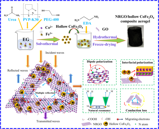 《Construction of three-dimensional hierarchical porous nitrogen-doped reduced graphene oxide/hollow cobalt ferrite composite aerogels toward highly efficient electromagnetic wave absorption》(Journal of Materials Science & Technology, 2023, 132, 193-200)论文以氧化石墨烯为模板,采用溶剂热-水热自组装两步法合成氮掺杂石墨烯/中空钴铁氧体复合气凝胶。研究发现,复合气凝胶具有独特的三维分级多孔网状结构;钴铁氧体的形貌和添加量对复合气凝胶的电磁参数与吸波性能具有显著的影响。当中空钴铁氧体的添加量为15mg和匹配厚度为1.8mm时,复合气凝胶具有最优的吸波性能,即最小反射损耗达-44.7dB、有效吸收带宽为5.2GHz。复合气凝胶的电磁衰减机理主要包括空间电荷在异质界面积累产生的界面极化损耗,石墨烯表面的结构缺陷、残留官能团及氮原子掺杂诱导的偶极极化损耗,磁性中空钴铁氧体引起的自然共振损耗,三维网状结构产生的传导损耗和多重反射效应等。