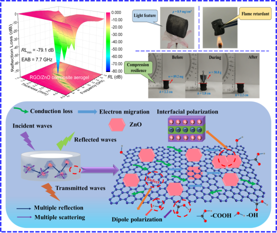 《Facile construction of three-dimensional porous netlike reduced graphene oxide/zinc oxide composite aerogels as the lightweight, flame retardant, compression resilience and high-performance electromagnetic wave absorbers》(Composites Part A, 2022, 160, 107068)论文以氧化石墨烯为模板、醋酸锌为锌源、柠檬酸钠为形貌调节剂、氢氧化钠为pH调节剂,采用简单的水热法制备了还原氧化石墨烯/氧化锌复合气凝胶。研究表明,通过改变柠檬酸钠的添加量可以有效调控复合气凝胶的微观形貌、电磁参数和吸波性能。当柠檬酸钠的添加量为0.8 g时,复合气凝胶具有最优的电磁波衰减能力,即最小反射损耗达-79.1 dB(99.99999%吸收),有效吸收带宽为7.7 GHz,完全覆盖Ku波段。此外,复合气凝胶具有极低的密度(8.9mg/cm3,约为空气密度的7倍)、良好的阻燃性能和压缩回弹性。因此,本文的研究结果对新一代轻质多功能电磁吸波剂的研发具有重要的指导意义。
