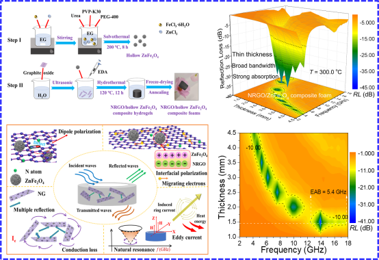 《Synthesis of hierarchical porous nitrogen-doped reduced graphene oxide/zinc ferrite composite foams as ultrathin and broadband microwave absorbers》(Journal of Colloid and Interface Science, 2022, 608, 2994-3003)论文采用溶剂热-水热两步法制备了锌铁氧体空心微球修饰氮掺杂还原氧化石墨烯复合泡沫。研究发现,通过改变退火温度,可以有效调控复合泡沫的石墨化度、磁性能、电磁参数和吸波性能。复合泡沫优异的吸波性能源于优化的阻抗匹配,增强的偶极极化、界面极化,多重反射、传导损耗、自然共振和涡流损耗等的协同作用。
